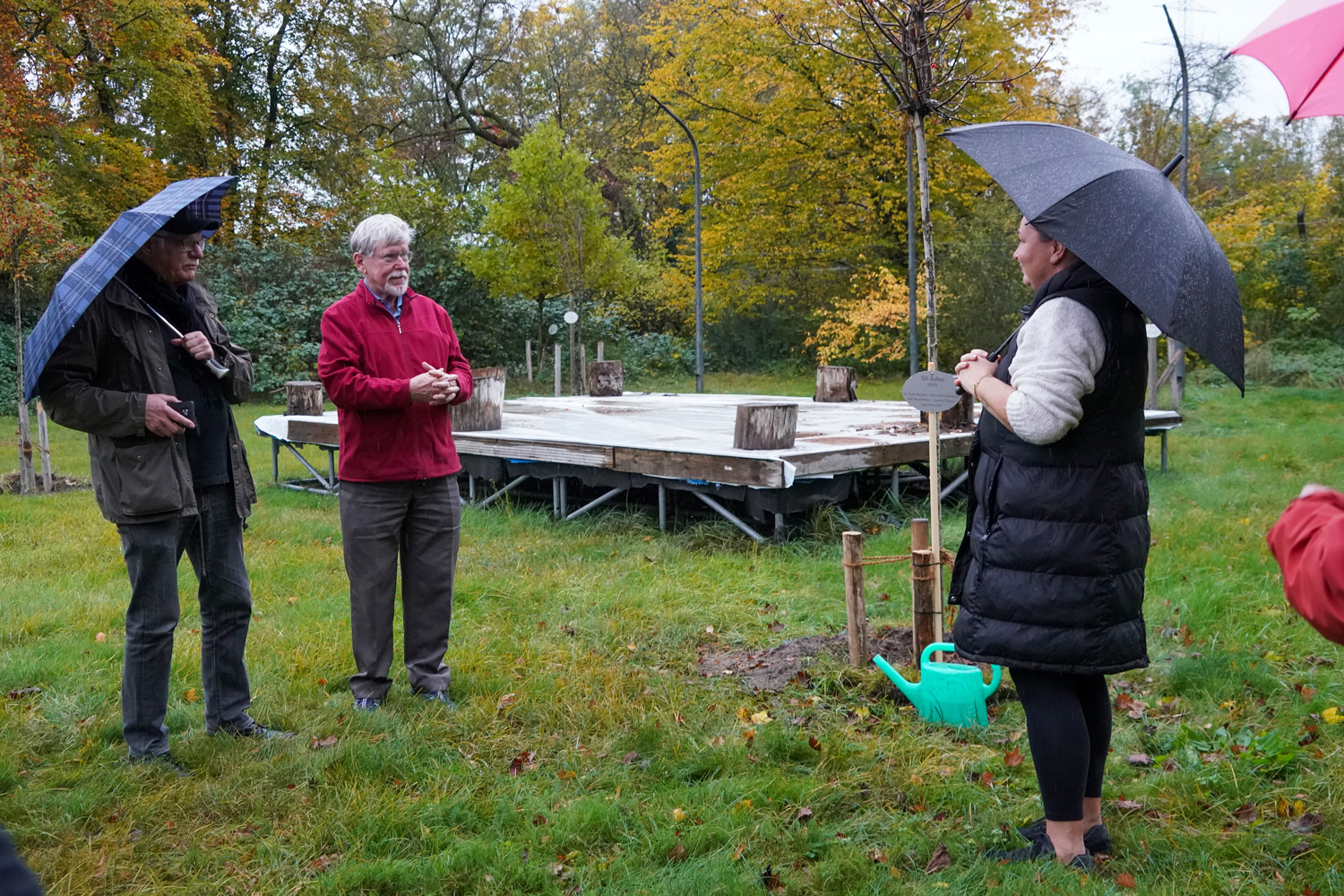 Trotz Regen ließ sich Anja nicht davon abhalten, gemeinsam mit Matthias (1. Vorsitzender), Wilfried (Fachwart Mitgliederangelegenheiten) und Uschi (Schriftführerin) den neuen Ehrenbaum anzugießen.